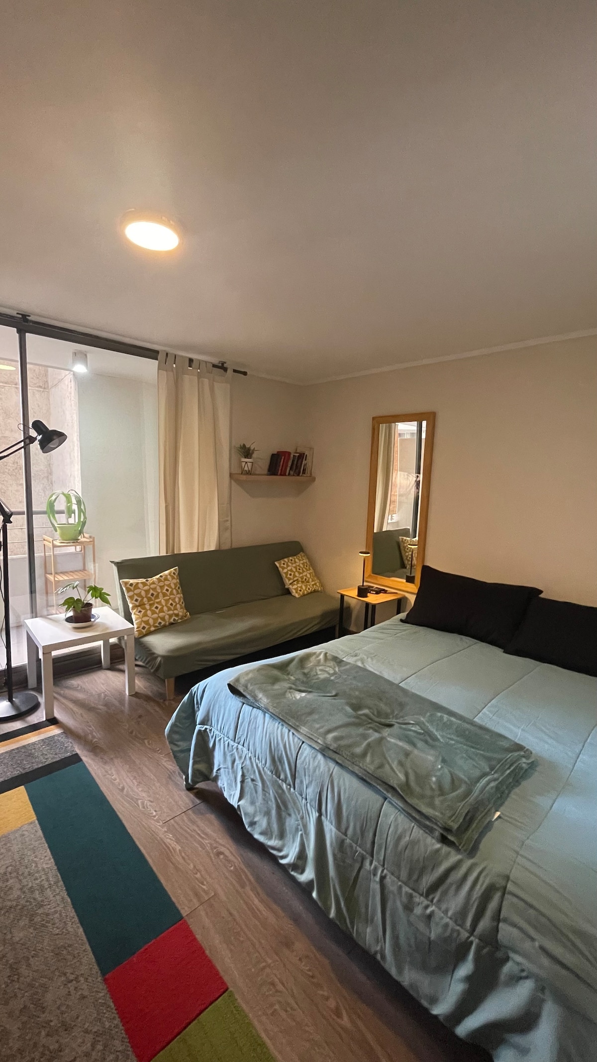Acollidor i lluminós apartament amb balcó, equipat amb un llit de matrimoni i un futon per a un tercer hoste. Cuina totalment equipada Wifi de 500 Mbps Televisió intel·ligent Emmagatzematge d'equipatge gratuït S'admeten animals de companyia A només 3 minuts del metro departamental, hi ha supermercats, restaurants i cafeteries a poca distància a peu. L'autopista central és a només 5 minuts. Gaudeix d'un gimnàs, zones de barbacoa i bugaderia d'autoservei en un edifici residencial segur amb conserge les 24 hores. Ideal per a parelles i estades llargues. Reserva i viu Santiago com si fossis a casa!
