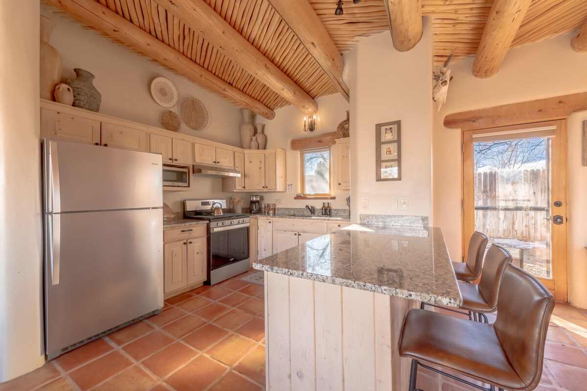 Dos Caminos Casita offers tranquil mountain views in a traditional adobe casita built over 100 years ago with updated amenities, natural light, Viga beams on the ceiling, and beautiful tile work. If you’re looking for comfort, relaxation, and beautiful views, you’ve found it here at Dos Caminos Casita. Enjoy a soak in our mineral hot tub while the Taos skies paint a canvas of rich purple, orange, blue, or pink. Perfect space to retreat to after a day of hiking, rafting, or skiing.