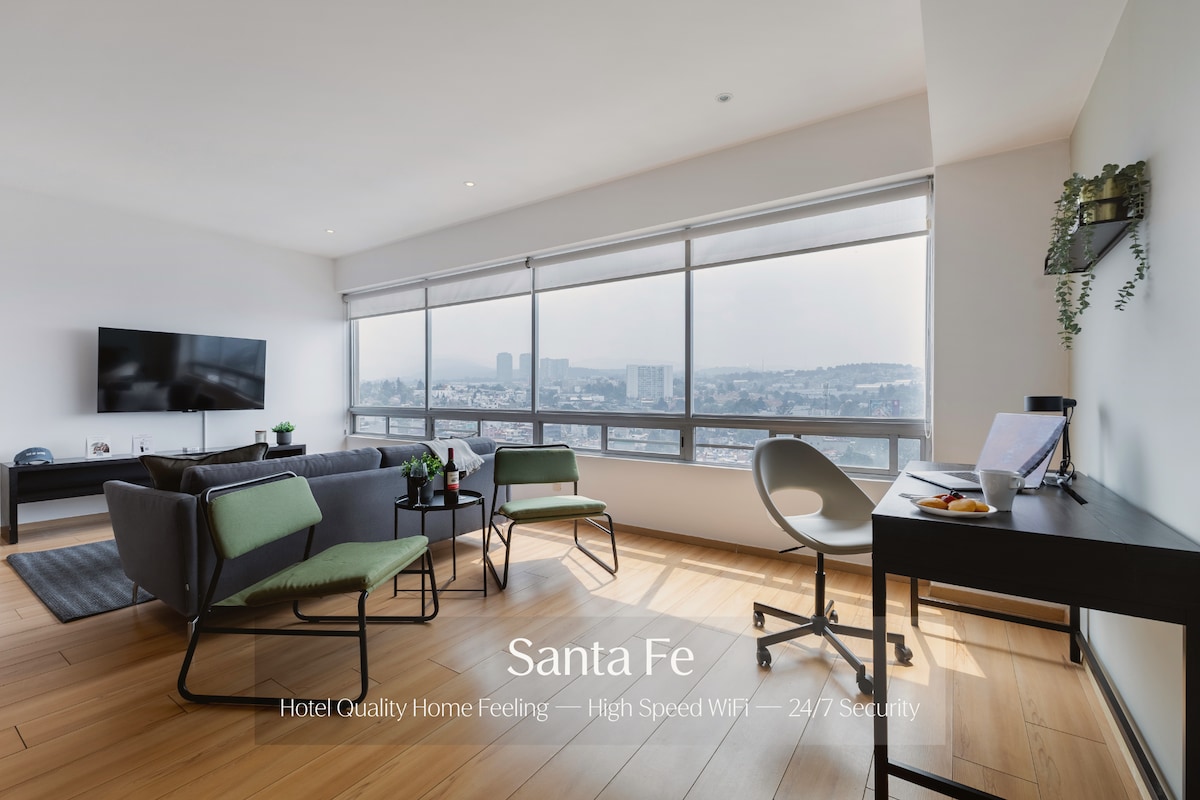Apartament complet amb llit «KING SIZE», bany i wifi sense fils. Preciosa vista cap a Santa Fe, menjador, cuina, microones, nevera, rentadora, planxa. Aparcament amb ascensors directes. Seguretat i vigilància les 24 hores, gimnàs Aquí et sentiràs com a casa, un lloc molt acollidor amb tot el que necessites per a la teva estada. Mini super en PB, 2 restaurants internacionals i Mexicano. Al costat de Santa Fe, molt a prop d'Interlimas, centres comercials, Ibero, Tec, diverses vies d'accés.