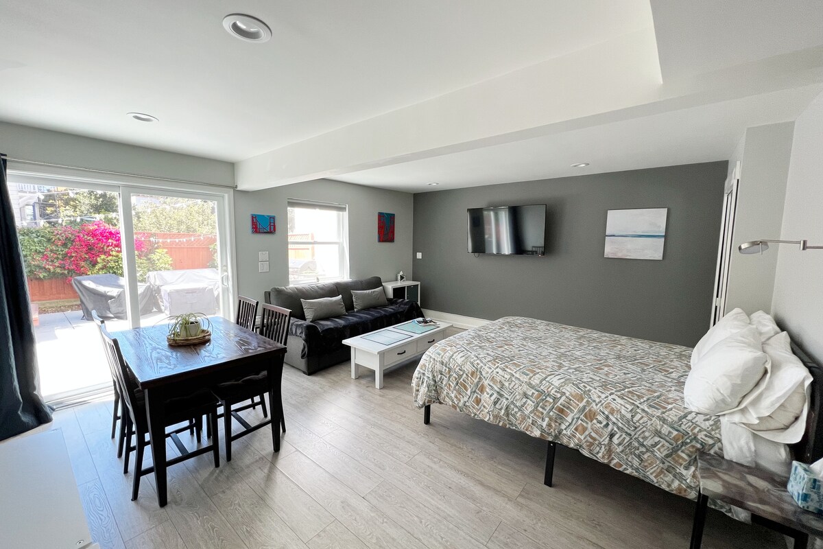 Aquest estudi bellament i recentment renovat amb entrada independent i bany privat es troba al centre de tot el que Santa Cruz té per oferir: el centre de la ciutat, platges, passeig marítim, West Cliff Drive, carrils bici, etc., són fàcils a peu o en bicicleta. L'estudi també és una zona tranquil·la per treballar a distància. Estem encantats d'allotjar-te i ajudar-te a fer que la teva experiència sigui fantàstica. També pots accedir als jardins comuns i a la banyera d'hidromassatge del pati del balneari (a petició).