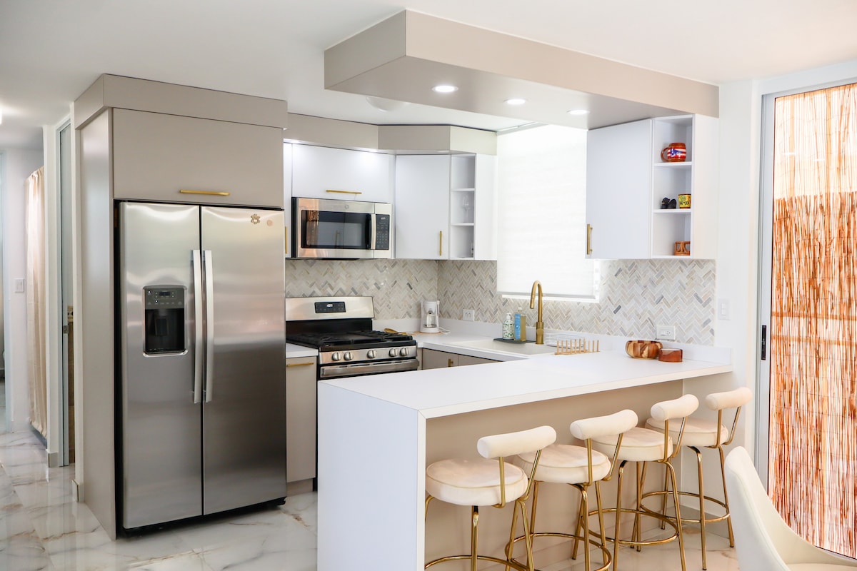 L'apartament és d'un dormitori, menjador amb taula i cadires, cuina amb estufa i nevera. Habitació amb aire condicionat, llit «queen size», llençols i frisos, televisor amb Netflix i armari. Bany amb dutxa, aigua calenta, tovalloles, paper higiènic, sabó, xampú i esbandir. A la cuina hi ha nevera, estufa de gas de quatre cremadors, microones, cafetera, plats, tasses, gots i coberts. A la sala d'estar hi trobaràs un sofà i una taula amb 4 cadires. Dipòsit d'aigua.