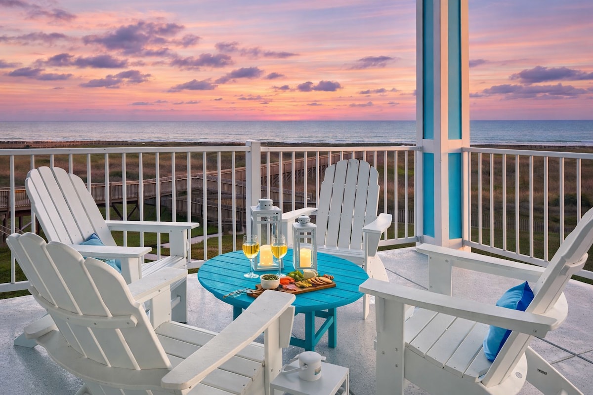 Et donem la benvinguda a The Galveston Getaway, la teva escapada privada a la vora del mar. Desperta't amb les ones, l'aire salat i les matinades resplendents des d'aquest luxós apartament boho a primera línia de mar. Aquest allotjament de 2 dormitoris i 2 banys té capacitat per a 6 persones i sembla un complex hoteler petit. Gaudeix d'un dels balcons més grans de Galveston amb vistes panoràmiques del golf, la piscina i la banyera d'hidromassatge a Babe's Beach. Gaudeix del cafè del matí, còctels al vespre i el so de les ones. Tovalloles i cadires de platja incloses: la platja t'espera.