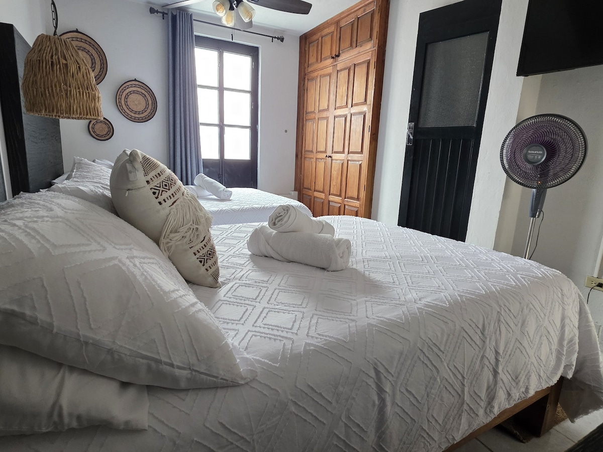 L'habitació 1 ofereix un espai íntim i acollidor, ideal per descansar després d'explorar San Miguel. El seu disseny minimalista, amb tons neutres i detalls moderns, et convida a relaxar-te en un llit còmode, acompanyat de teixits suaus i coixins elegants. La llum natural que entra per la finestra crea un ambient càlid i fresc, perfecte per gaudir d'una estada tranquil·la.