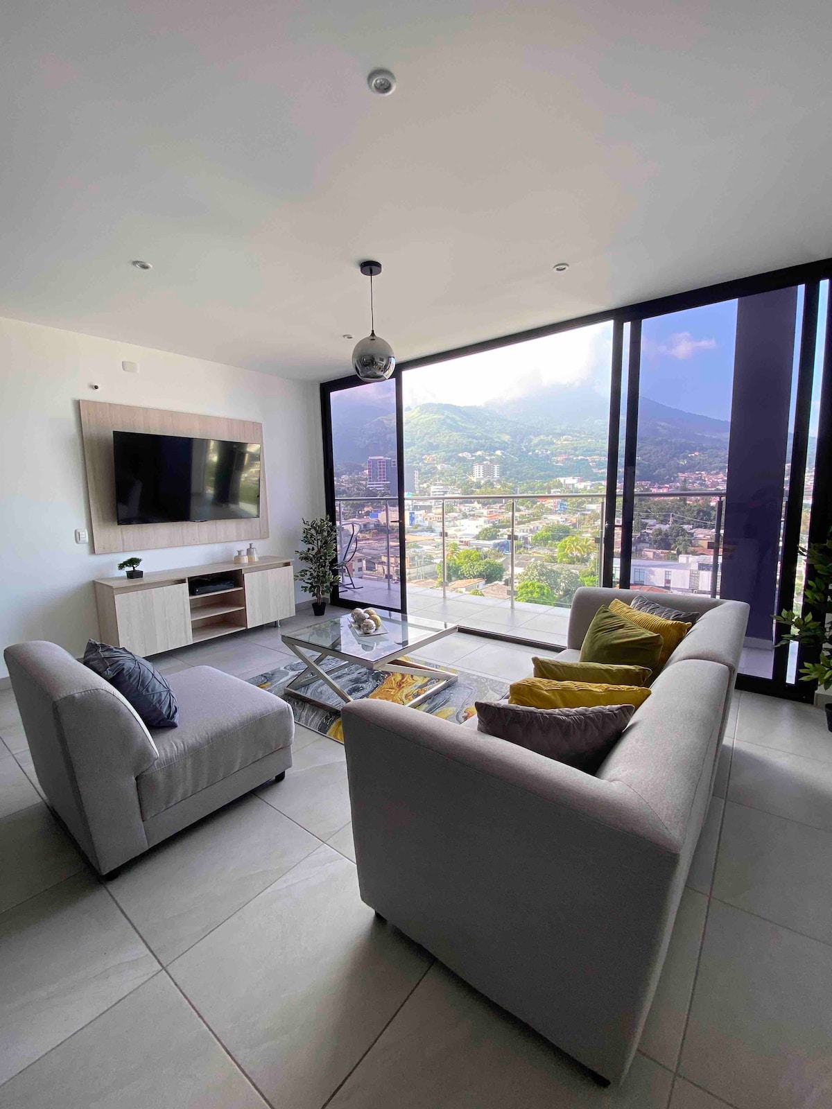 Cozy, spacious and modern apartment in a central area, with a stunning view of the city and the San Salvador volcano. It is very well equipped with everything you need for a pleasant stay. With fast Wifi, TV, hot water, air conditioning in rooms and living, kitchen with everything you need. Balcony with great city view Perfect for families Very well located, less than 5 minutes from the largest shopping centers, restaurants and bars. Safe and exclusive area.