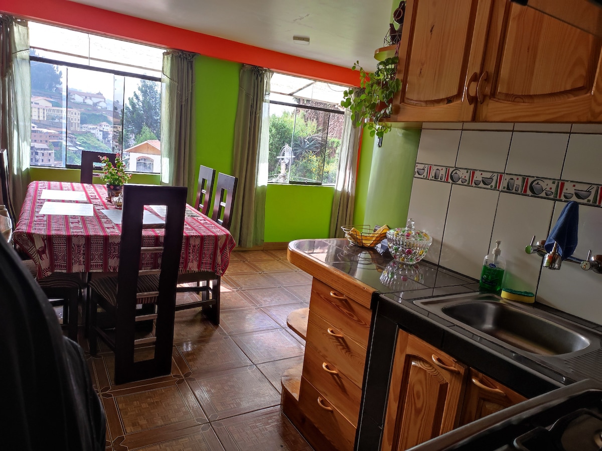 Allotjament tranquil, espaiós i net en una zona cèntrica de Cusco A prop de: Restaurants, supermercats , autobusos i taxis amb les millors vistes de la ciutat i el millor temps, El pis té grans finestrals per apreciar tota la ciutat, cortines gruixudes per enfosquir-ho tot i descansar millor, La cuina petita amb tot el que necessites per fer que la teva estada sigui com si estiguessis a casa Llit queen molt còmode i dos tipus de coixins ( tous i rígids)per a totes les preferències