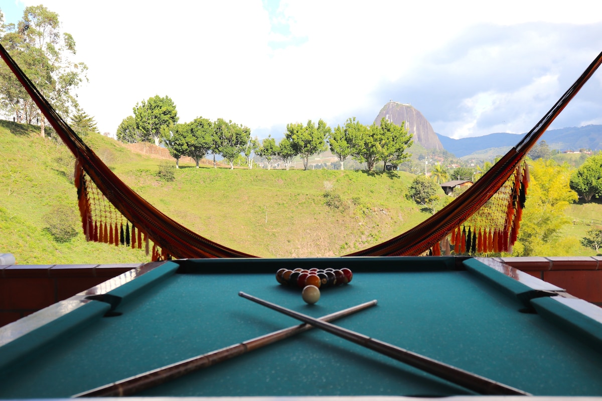 Estaran rodeados de una vista espectacular a la represa de Guatapé y la imponente Piedra del Peñol.Nuestra piscina y jacuzzi perfectos para relajarte creando un ambiente mágico para compartir al aire libre con un buen asado en nuestra zona BBQ y crear recuerdos inolvidables. Estamos a solo 16 min del pueblo guatape y el peñol. Via 80% pavimentada y 20% destapada Nota: El Agua del jacuzzi es de agua NATURAL solo en ocasiones puede llegar algo turbia mas la entregamos recien cambiada y limpia
