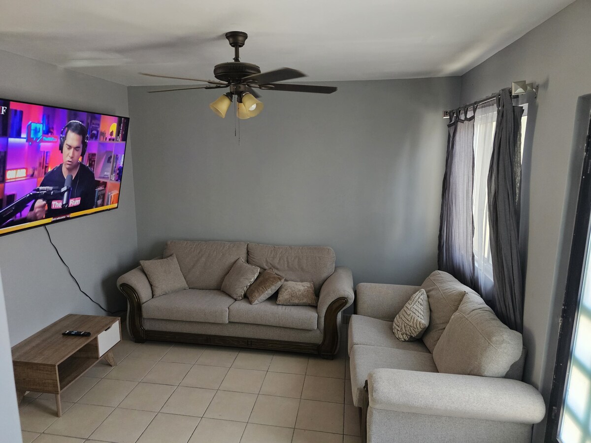 Pis totalment equipat ideal per a una estada agradable amb tots els serveis d'aigua calenta, tinaco, aire condicionat(fred/calor), estris de cuina, electrodomèstics, servei del camí com a televisor de pagament (totalplay), internet. A prop de compres, compres, fàcil accés. També tenim un garatge cobert (4,10 metres de llarg) amb una porta elèctrica per a un cotxe de mida mitjana.