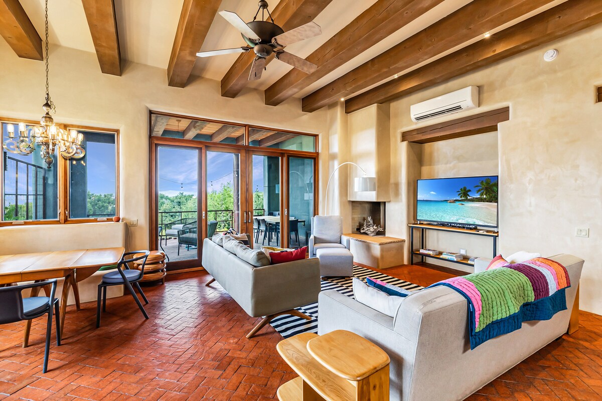Situat sobre el riu Santa Fe, amb vistes a les muntanyes Sun i Atalaya, rutes de senderisme accessibles des de la porta principal i les botigues, galeries i restaurants de Canyon Rd. a poca distància a peu, "Sage Haven" destaca la simplicitat i la tranquil·litat atemporals. Construïda el 2020, la casa té una nova wifi forta, televisors intel·ligents amb AppleTV, electrodomèstics Bosch per a la cuina i la bugaderia, una llar de foc de llenya, terrasses, banys de luxe i un dormitori profundament còmode.
