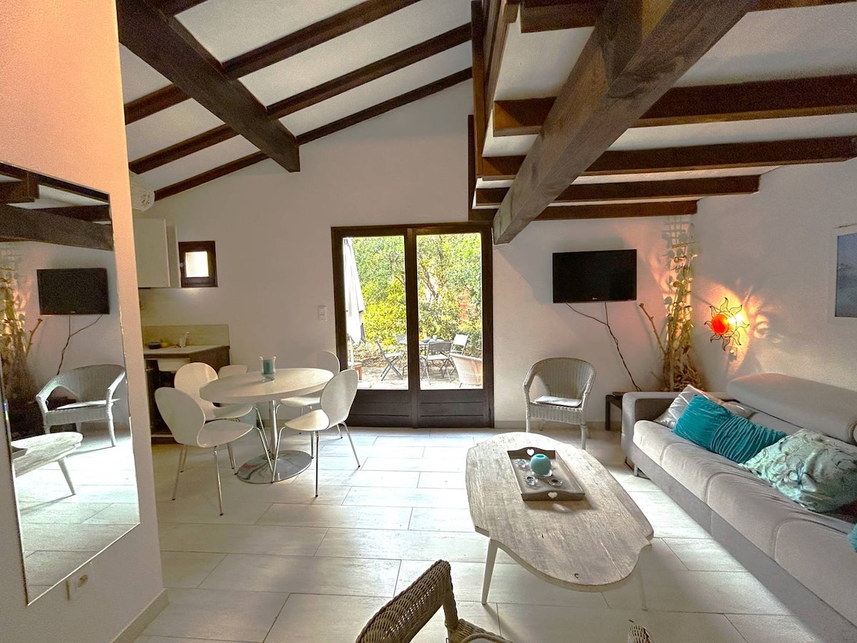 Luxe i relaxació a 3 minuts a peu de la sublim platja de Santa Giulia (a 7 km de Porto-Vecchio) i a 25 minuts de l'aeroport de Figari. El luxe d'una suite d'hotel, l'hospitalitat d'una pensió i l'autonomia d'un apartament moblat! Casa de luxe en una residència privada al parc boscós. Aire condicionat, wifi, terrassa, jardí, barbacoa, aparcament privat... 4 llits: llit doble 160 + EN llits individuals (90x2). Llençols i llençols INCLOSOS. ⚠️NETEJA 80 € A PAGAR IN SITU. Paddleboard gratuït*. 🚙 Cotxe de lloguer. Excursions en Zodiac.
