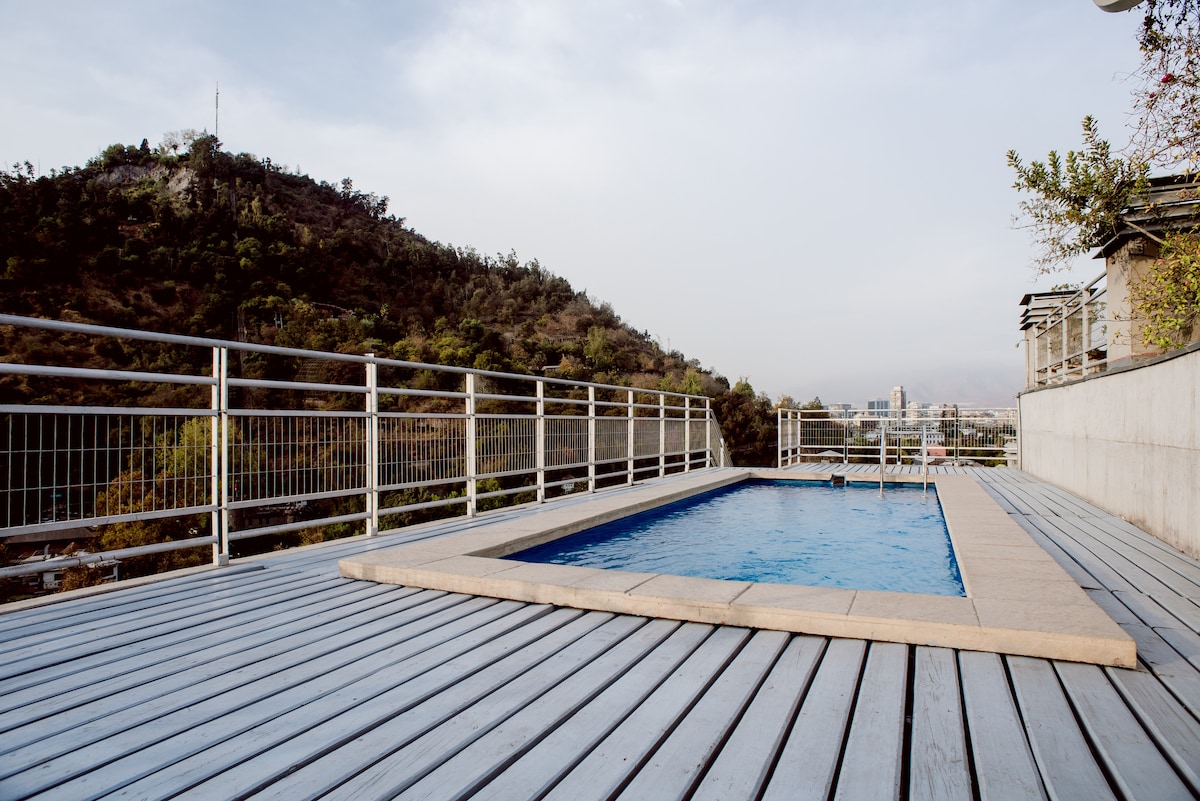 En els SEUS 60 m2 distribuïts en dos nivells té una alçada doble, menjador-cocina, dormitori, vestidor, serveis, totalment equipat. Espai molt còmode, fins i tot per a 3 persones. Disposa d'un llit doble doble, un llit de matrimoni futon a la primera planta (sala d'estar) i una escala no apta per a nens menors de 12 anys. L'edifici és obra d'un arquitecte xilè avantguardista i està equipat amb seguretat les 24 hores, càmeres de vigilància, bugaderia, aparcament per als visitants, terrassa amb vista panoràmica (9è pis) que inclou: piscina, gimnàs, zona de barbacoa, espai per a esdeveniments i wifi. M'agrada compartir-ho amb els hostes , si ho consideren convenient. El barri de Bellavista està envoltat de tres grans parcs i a prop del centre històric de la ciutat. Té una vida bohèmia intensa i entretinguda, amb restaurants, bars, teatres, discoteques, punts d'informació turística i lloguer de bicicletes. Tots els llocs d'interès turístic del centre de Santiago són accessibles a peu o en bicicleta. Per a distàncies més llargues recomano l'estació de metro de 400 metres o taxis. A causa de la seva ubicació estratègica, el barri de Bellavista està a prop del centre històric de la ciutat de Santiago, que et permet passejar per ell accedint pel Parc Forestal. A l'interior del Loft hi ha una exposició d'artesania d'artistes locals.