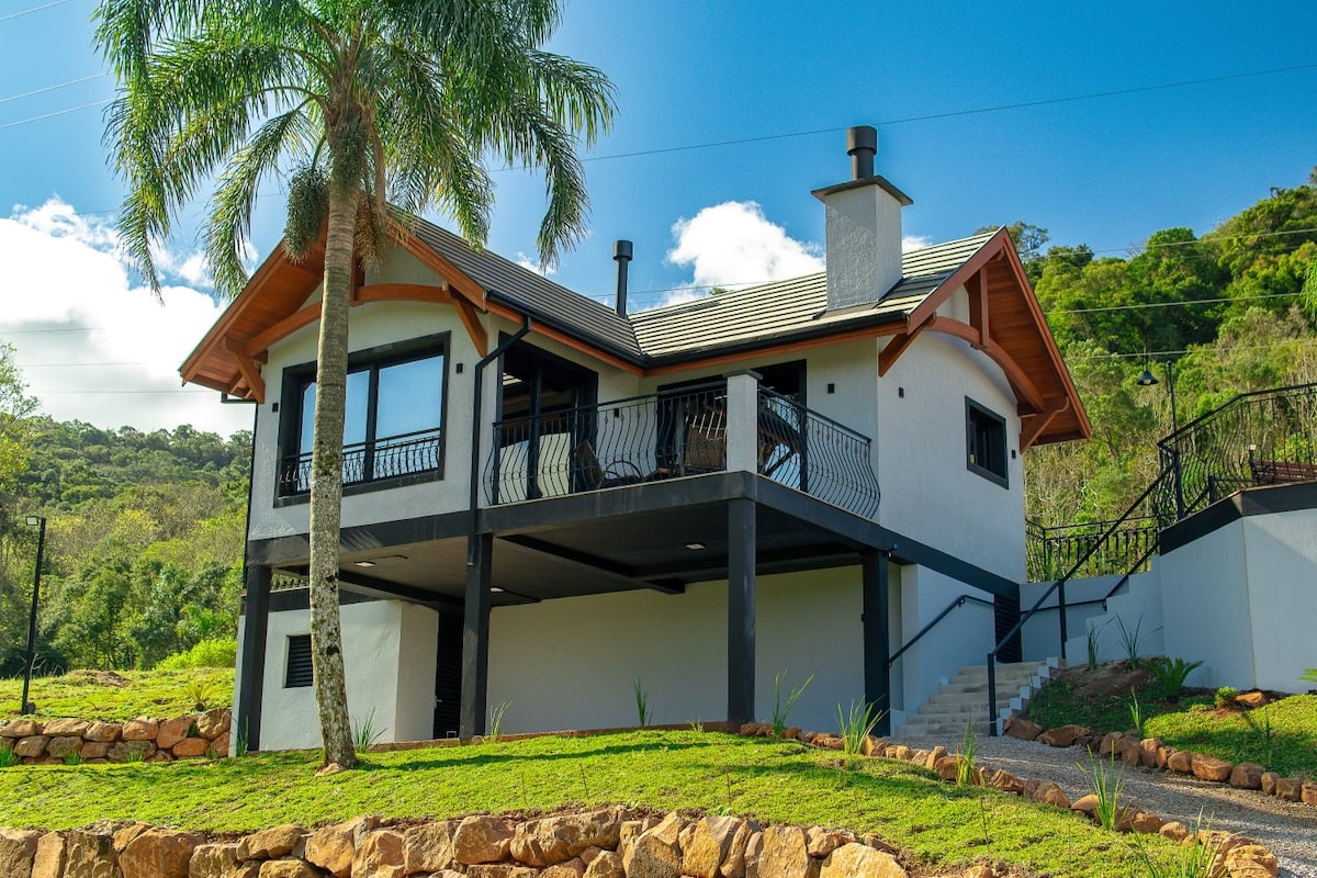 Estem situats a l'interior de Nova Petrópolis, en un poble bucòlic anomenat Nine Colonies, a 15 minuts del centre. El nostre xalet va ser construït tot en fusta autòctona de pins araucaria, proporcionant calidesa i comoditat als nostres hostes. El xalet està equipat amb banyera d'hidromassatge amb vista panoràmica, llar de foc, aire condicionat, televisió intel·ligent amb 130 canals, wifi (fibra òptica), cuina completa, així com una terrassa amb hamaca i vistes a la vall.