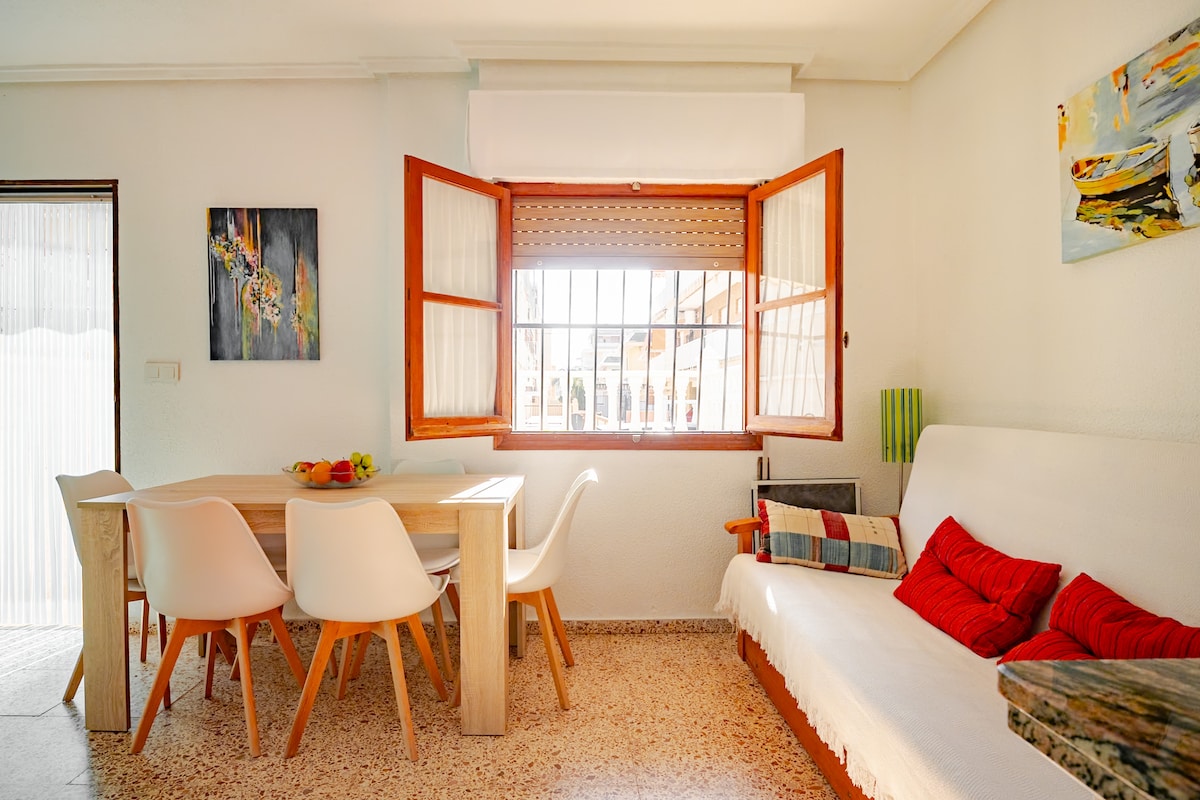 Bonic bungalow a prop de la platja ideal per a famílies. Disposa de terrassa amb zona chill-out amb televisió, una gran sala d'estar amb sofà llit, dos dormitoris (un amb llit doble i l'altre amb dos llits de 90) i un bany amb dutxa. També està totalment equipat amb electrodomèstics de tota mena. L'aparcament és molt fàcil d'accedir ja que es pot aparcar a la mateixa porta. Aeroport a només 10 minuts i Alicante a uns 15. Molt ben situat.