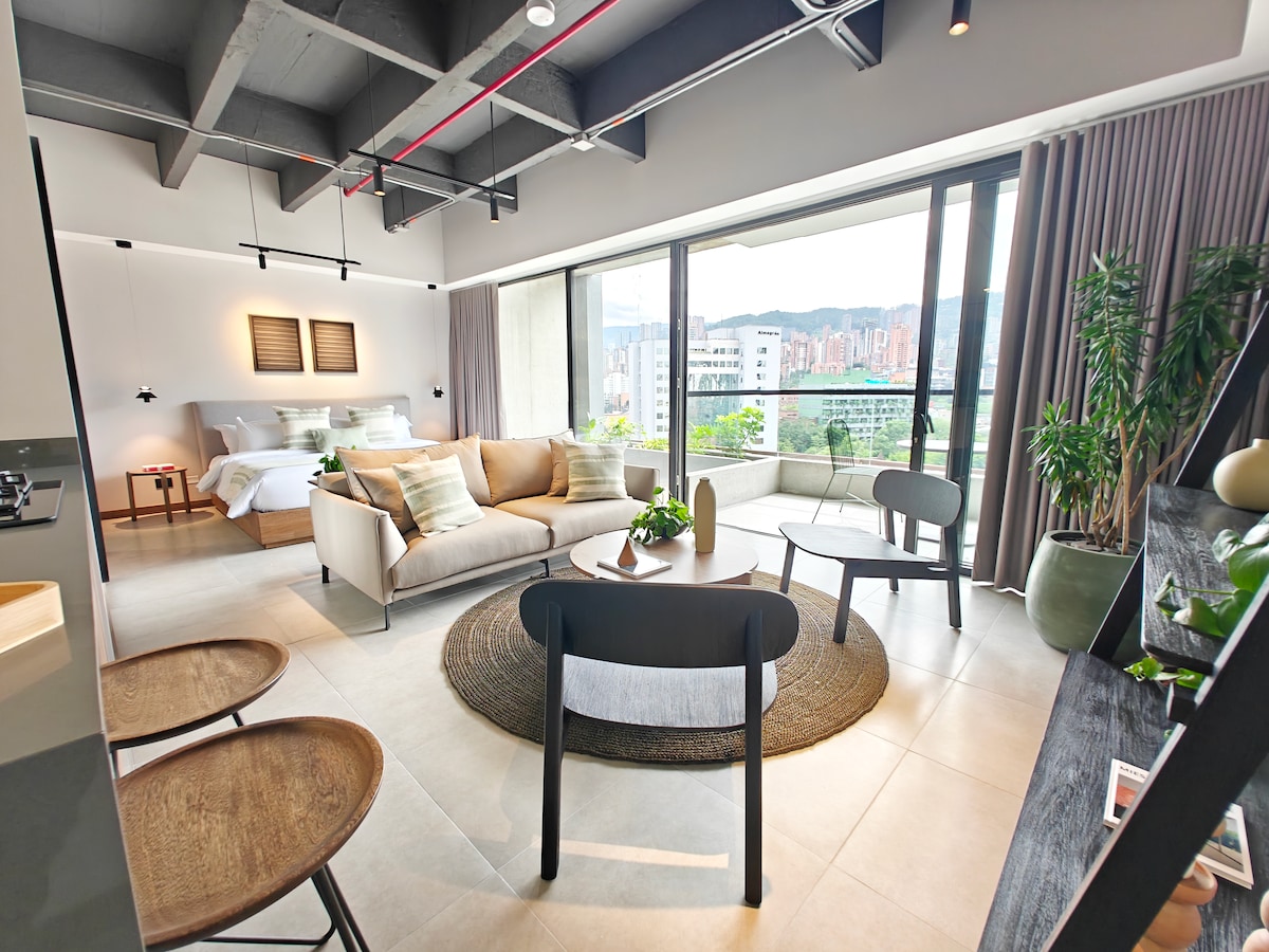 Pis nou, totalment moblat de 51 metres + 15 metres de terrassa. Gaudeix d'aquest pis en un lloc tranquil i cèntric, situat al Poblado, un dels sectors més exclusius de Medellín, a només 5 minuts a peu de l'estació de metro d'Aguacata i a 10 minuts a peu d'un dels centres comercials més grans de la ciutat. L'edifici de la sala d'estar Go té accés gratuït a una zona de coworking i al gimnàs. També disposa de servei de seguretat les 24 hores i aparcament gratuït.