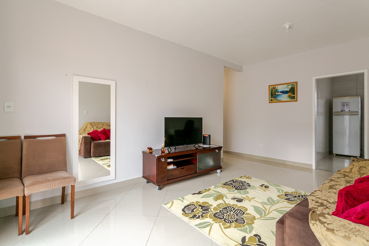 Nou, ideal per a aquells que viatgen per feina o per oci, excel·lent ubicació, a 300 metres del mercat i de l'avinguda principal amb diversos restaurants, a 10 minuts del centre de Floripa. L'estudi estava dissenyat per acollir còmodament una persona o una parella. Wifi, TV, nevera, estufa, microones, cafetera, cafetera, bullidor elèctric i estris de cuina bàsics. L'edifici també té una estructura de piscina, gimnàs, ascensors, espai per a animals de companyia, bugaderia, garatge individual.