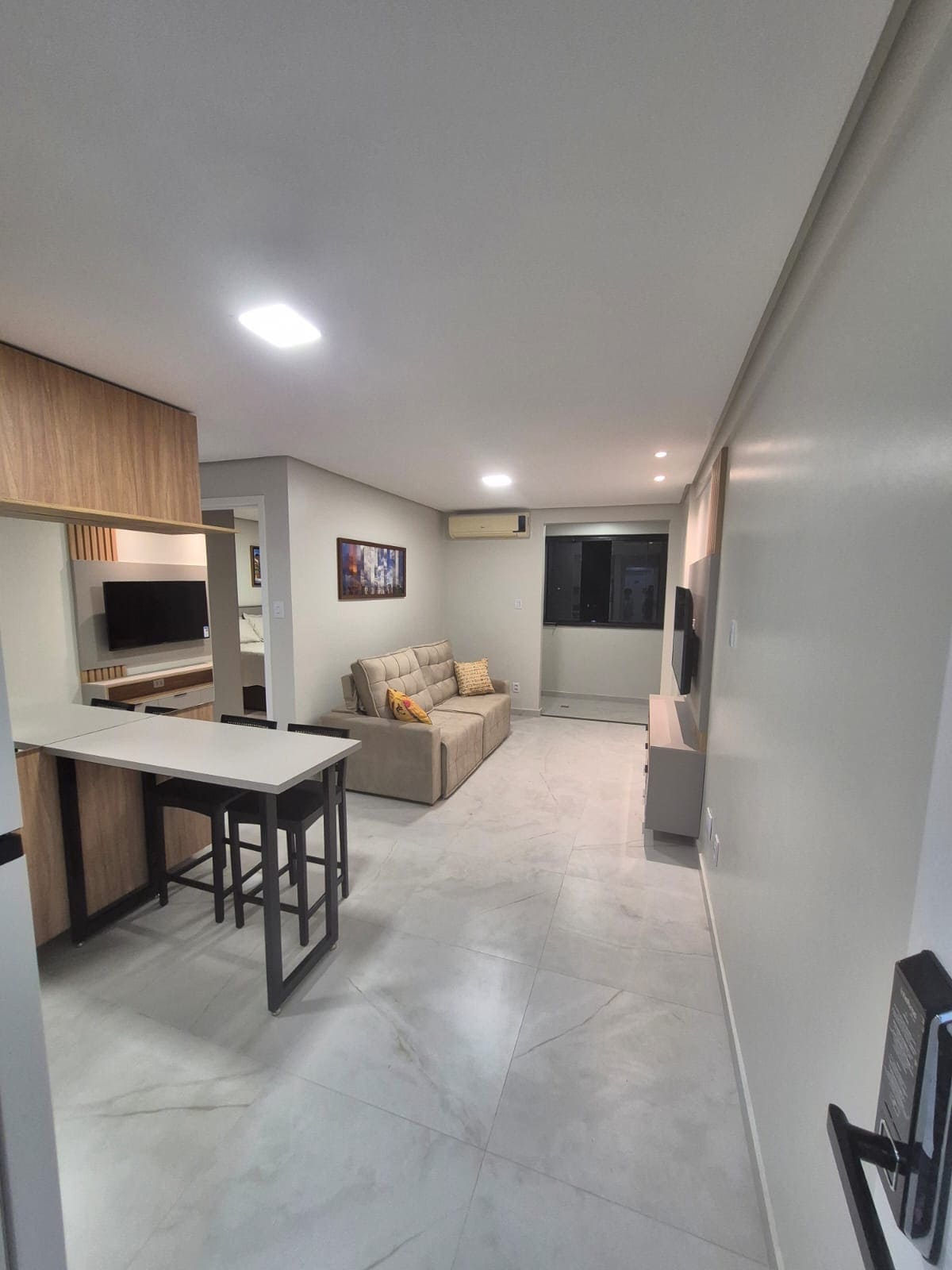 Studio model apartment, located on Avenida dos Holandeses, in the Calhau neighborhood. With 30 m², it features a balcony with a city view. The space combines bedroom and living room with an open-plan kitchen and private bathroom. The apartment accommodates up to three people and has a digital lock on the door. The condominium offers a complete leisure area, remote concierge, 24-hour reception with doorman, and a parking space. Located near beaches, supermarkets, and restaurants.