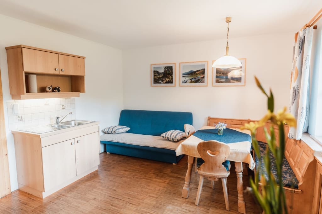 Die helle, freundliche, mit Vollholzmöbel und Holzfußböden ausgestattete Ferienwohnung Bergsee bietet Ausblick Richtung Westen, auf unsere Wiesen und einen nahegelegenen Berg. Die Wohnung besteht aus einem Schlafzimmer mit Doppelbett, Bettdecken in Überlänge einer Wohnküche mit Eckbank, großer, voll ausgestatteter Küchenzeile mit E-Herd und Backrohr, Kühlschrank mit Gefrierfach, Geschirrspüler, Filterkaffeemaschine, Wasserkocher,... und Schlafsofa, einem Badezimmer und einer Toilette (getrennt)