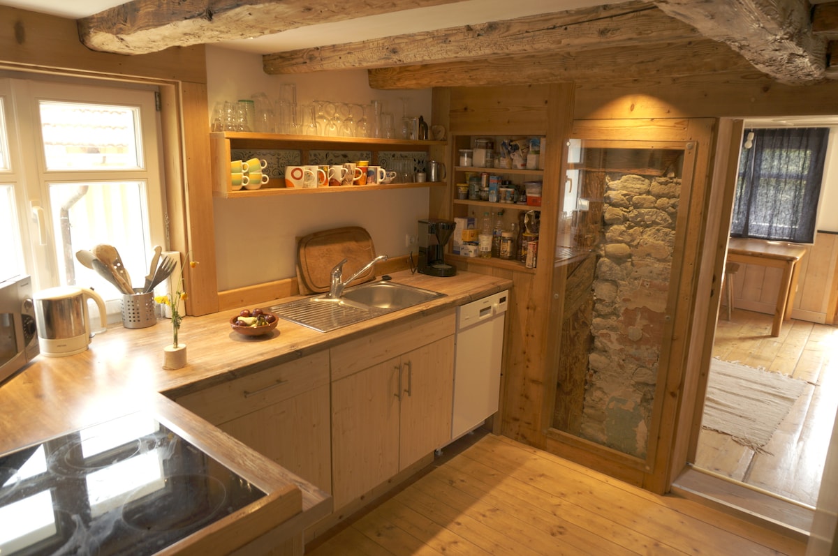 La nostra casa té uns 300 anys d'antiguitat, una típica casa de colons allgäu feta de fusta, de la qual cada vegada n'hi ha menys. L'hem restaurat molt ecològicament i equipat amb totes les comoditats modernes que vulguis: fogons de ceràmica, forn, rentadora, microones, dutxa extragrande, rentadora, wifi, etc. Si escalfes amb llenya a l'hivern, fa una olor còmoda a tota la casa. El guix d'argila fa que l'habitació sigui un clima acollidor. A la porta de casa trobaràs una pastisseria i una llet.
