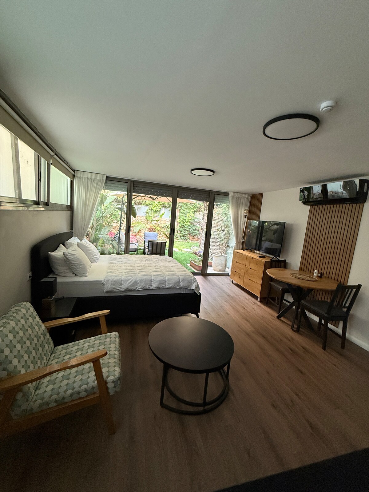 ⸻ Stylish garden suite with a fresh, modern design in one of Tel Aviv’s safest and most desirable areas. Enjoy ultra-fast fiber Wi-Fi, powerful new AC, fully equipped kitchen with Nespresso, new bathroom, and all-new furniture. Washing machine and dryer in the yard. Step out to a private garden with seating. Free street parking is usually available. A shared shelter is just 5 meters away. The perfect calm and relaxing stay in Tel Aviv.