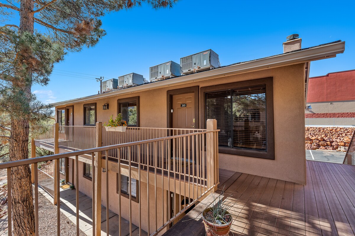 Relaxa't al nostre tranquil apartament de Sedona, a pocs minuts de rutes de senderisme, cafeteries i botigues. Gaudeix d'un llit «queen size» amb un matalàs de gran qualitat i un elegant bany de marbre. La cuina totalment equipada inclou estris de cuina i estris per a la teva comoditat. El total inclou 100 $ en concepte de despeses de neteja, que es destinen directament al nostre equip de confiança. Sense càrrecs ocults. Som de Sedona i estem aquí si necessites res. Gràcies per donar suport a les petites empreses locals! Atentament, Angel (propietària) i Nancy (gestora d'immobles)