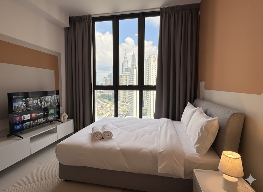 Stylish 1BR sky suite with a private balcony facing KLCC and KL Tower. Enjoy sky dining from your balcony while watching the dazzling light shows from both iconic towers every night. King bed, rain shower, full kitchen, washer with drying rack, Netflix, high-speed WiFi. Relax at the infinity pool, rooftop jacuzzi, and gym. Walk to Jalan Alor, Pavilion, Bukit Bintang, and the new TRX Mall. 24-hour check-in. Airport pickups and local tours available. Your perfect KL stay begins here!