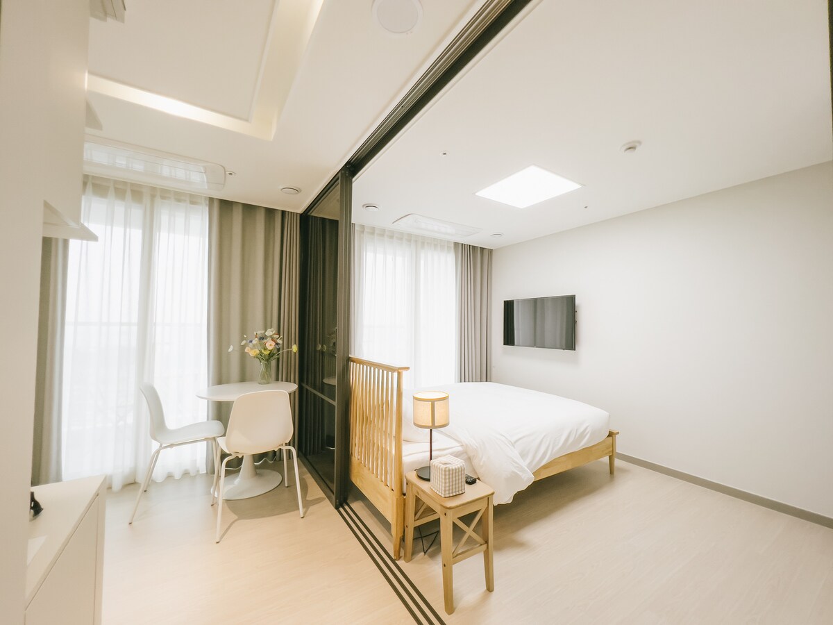 És un allotjament encantador on pots curar el cor amb un interior net i acollidor, i un mar fantàstic, platges de sorra i onades panoràmiques amb vistes a la planta mitjana. 🏖🏝🌊 Està connectat amb Yangyang Jukdo Beach i Population Beach, un lloc sagrat per fer surf. Si passeges per la carretera de la coberta, arribaràs a Yangnidan-gil ~!🛤 També gaudeix d'unes vistes espectaculars del mar de l'Est i de la sortida del sol des de la propietat a través del balcó.🌅🌌 Pots seure al balcó i prendre una tassa de cafè. Aquest és el lloc ideal per prendre un cafè de debò👍☕️☕️☕️ A 22 minuts de la terminal general de passatgers de Yangyang, Es troba a 37 minuts de la terminal d'autobusos interurbans de Gangneung. És una habitació que ofereix comoditat i comoditat, i consta d'un llit de matrimoni. ▶Arribada sense contacte (pots introduir el número del teclat numèric de l'anunci) Llençols esterilitzats d'alta temperatura proporcionats per una bugaderia▶ professional ▶Desinfectant, desinfecció a través d'esprai, desinfecció ▶Hi ha cuina independent disponible (es proporcionen estris de cuina i vaixella, com ara olles i paelles) ▶Netflix (inicia sessió amb el teu compte per veure-ho) Temps de resposta del ▶missatge: de 09:00 a 23:00