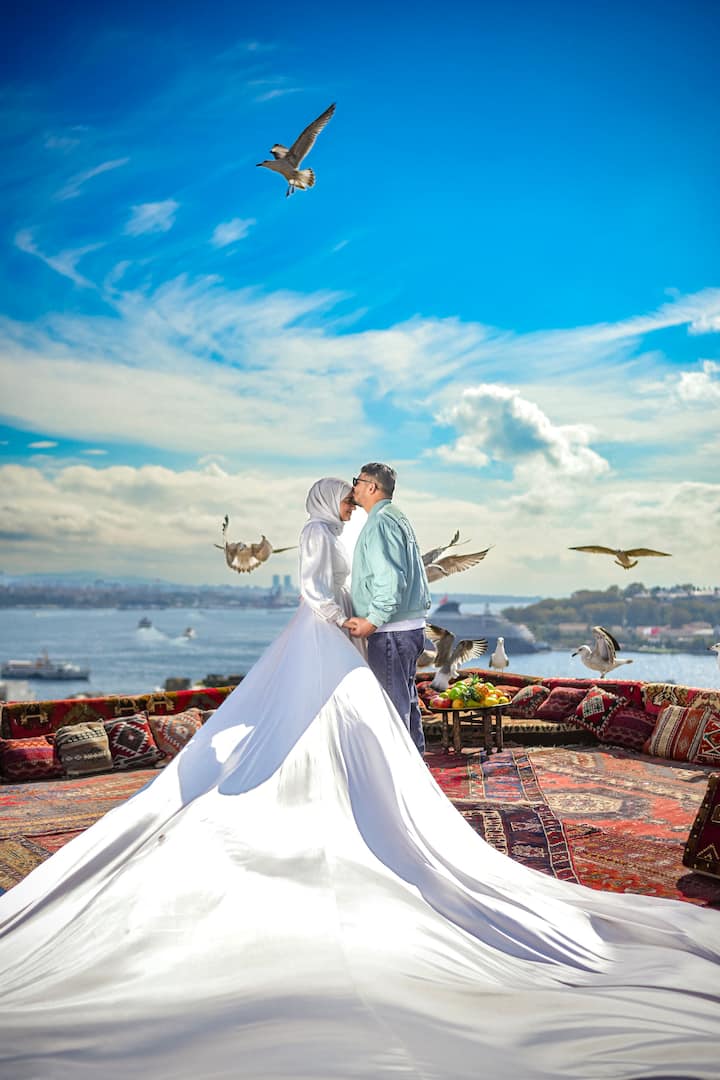Una sessió de fotos de casament a Istanbul, que combina l'encant històric amb les impressionants vistes de la ciutat, capturant l'elegància d'un vestit blanc contra el perfil atemporal de la ciutat.