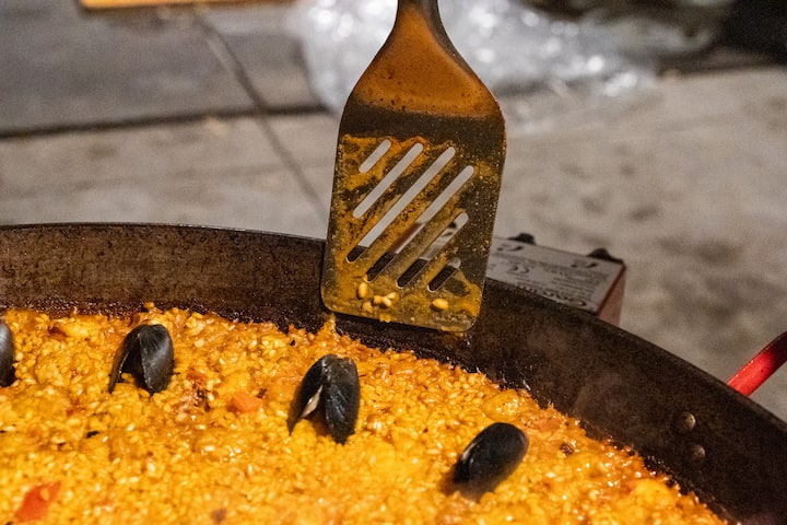 Autèntica paella de marisc d’Espanya, cuinada en directe per en Roberto. Aquesta paella inclou gambes, musclos, calamars, cloïsses i, de vegades, peix, combinats amb sofregit (una base de salsa de tomàquet, all i cebes), arròs bomba, safrà, pebre vermell i caldo de peix per a un acabat salat i daurat.