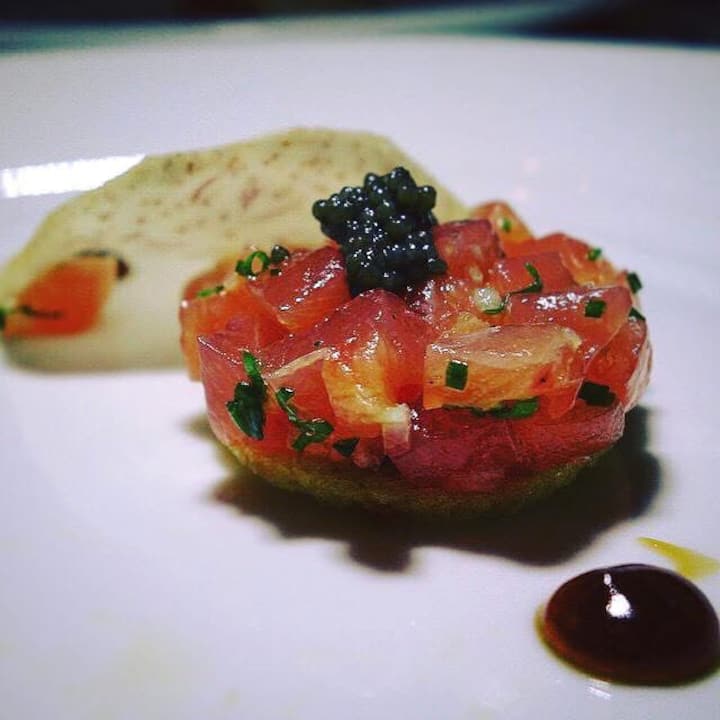 -Aperitiu: poke de tonyina a l'estil hawaià, ceba, arròs de sushi, aioli de safrà.