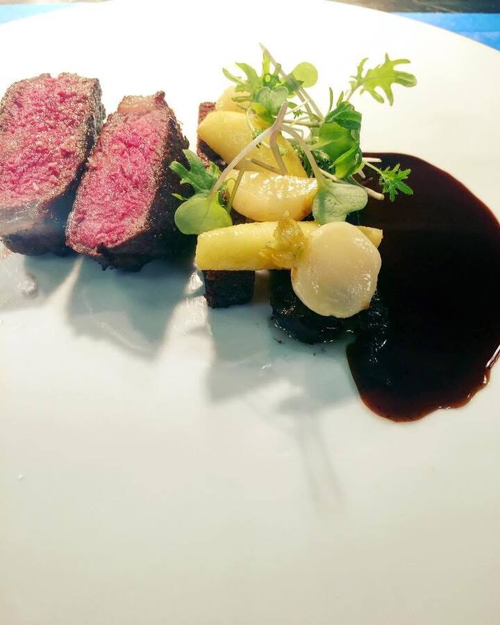 -Peix: llobarro negre escalfat amb mantega, crosta de xufa i pistatxo cruixent. Barreja de bolets. Beurre blanc de llimona.