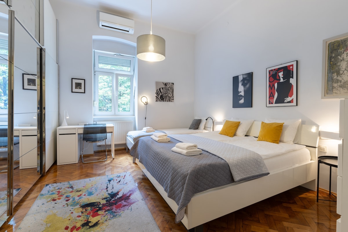 La millor ubicació de Zagreb, literalment a 2 minuts a peu de la plaça principal i a 1 minut a peu del parc central Zrinjevac (50 metres). Aquest bonic apartament ha estat totalment renovat recentment i totes les coses són noves. És ideal per a 5 persones i està totalment equipat: wifi, aire condicionat, calefacció central, rentadora, assecadora, rentaplats, televisor intel·ligent Android de 140 cm, forn, microones, etc. La parada del tramvia és a 2 minuts a peu (plaça principal). La botiga és a 1 minut a peu. És a la segona planta sense ascensor.