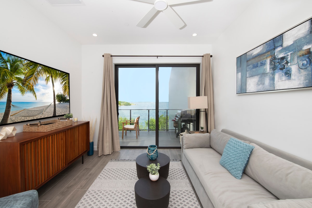 Santuario contemporani net i fresc amb vistes a l'aigua; un apartament de dos dormitoris/dos banys amb una cuina completa i una sala d'estar amb tots els serveis populars (wifi, televisió per cable, Apple TV, Netflix, consola de jocs Playstation, aire condicionat central, planxa i taula de planxar, rentadora i assecadora, pati exterior, piscina i aparcament gratuït) - situat a Grand Harbour. Les botigues de Grand Harbour i Harbour Walk són al costat. Perfecte per explorar i gaudir de tot el que ofereixen les illes Caiman.