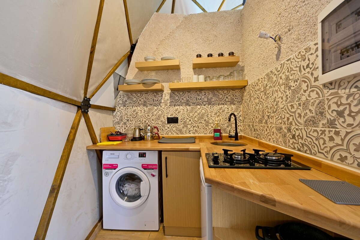 Les nostres vil·les amb cúpula al poble d'Islamlar de Kaş Kalkan estan dissenyades com a 1+0 i tenen capacitat per a 2 persones. Disposem de 5 vil·les amb cúpules amb el mateix concepte d'interior a la natura i amb PISCINA PRIVADA al poble de Kaş Domes/İsla Mlar.