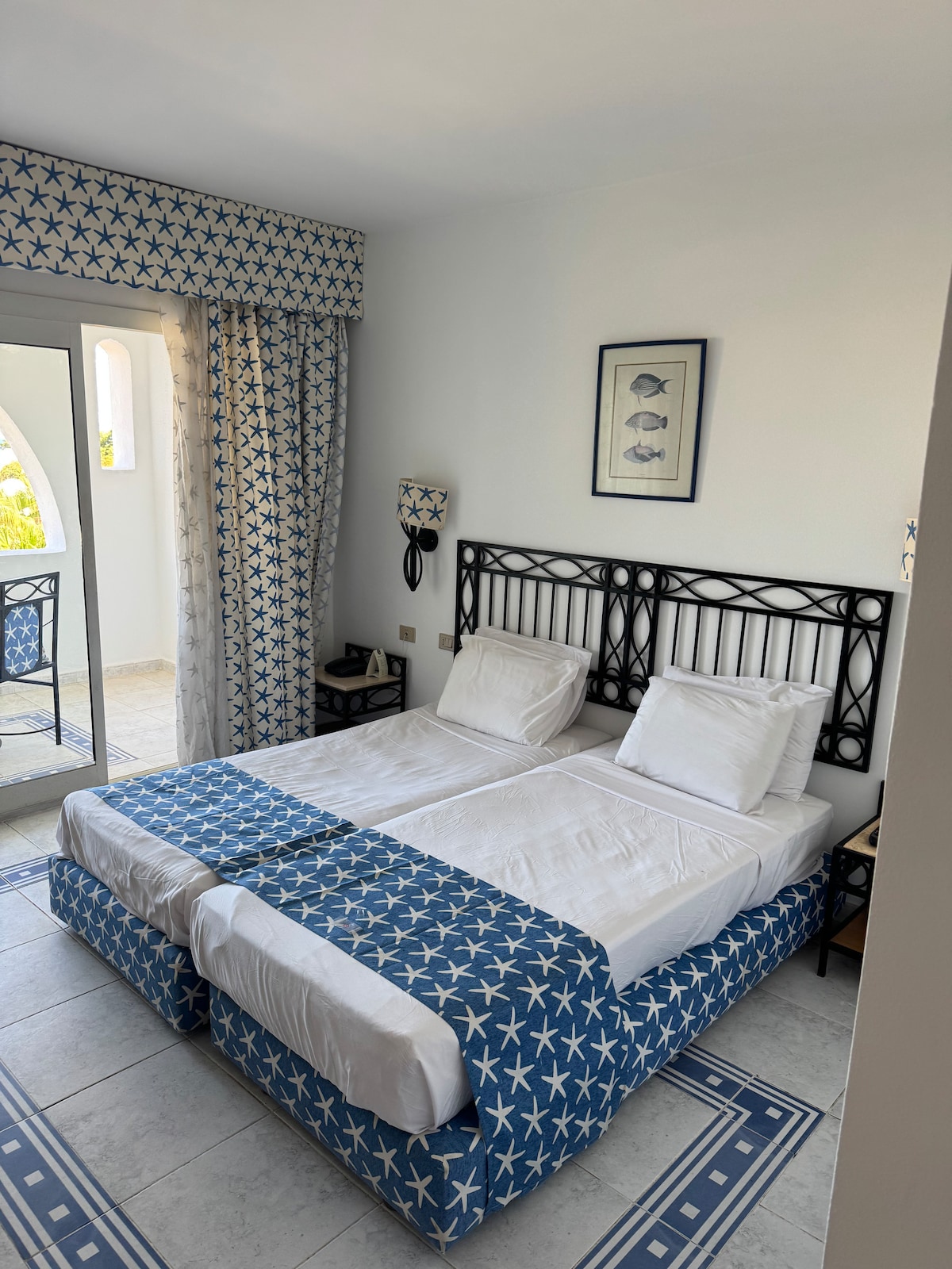 Una habitació privada a Harem hotel, Domina Coral Bay Resort , Sharm el Sheikh. Dos llits, sala d'estar, vestidor, bany enorme i un balcó amb vistes a la vegetació i al mar vermell. L'habitació té assecador, nevera, microones, caixa forta, bullidor i televisor. Els hostes porten el seu sabó, xampú i gel de dutxa. No hi ha wifi a l'habitació. A 10 minuts de l'aeroport. A 5 minuts de la badia de Naama. A 15 minuts del mercat antic. No hi ha àpats inclosos.