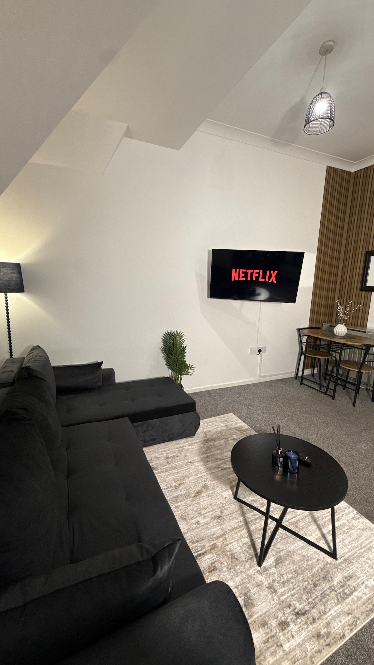 Relaxa't al nostre elegant pis central de la carretera Ecclesall de dues habitacions. L'apartament té tot el que necessites per relaxar-te i relaxar-te durant l'estada. Amb el saló que ofereix un televisor 4K muntat a la paret de 75"en un modern teló de fons de slatwall, taula de menjador amb il·luminació ambiental. Ambdós dormitoris ofereixen llits king size amb matalassos Simba. La cuina té electrodomèstics integrats amb cafetera amb càpsules de cortesia. El bany té una dutxa gran a peu amb característiques negres mat contemporànies