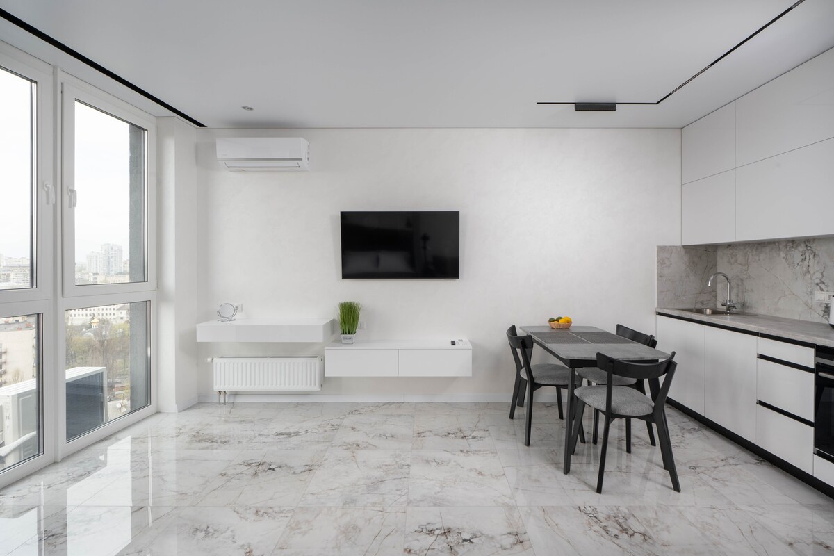 Descobreix la pau minimalista al nostre pis d’un dormitori de disseny al bell mig de Kíev. Espai: llit «queen size», televisor intel·ligent, aire condicionat i wifi d'alta velocitat. Cuina: totalment equipada amb cafè i te. Ubicació: edifici nou a prop de l'estació de metro Universytet i del parc Shevchenko. Tranquil, però a quatre passes de les millors cafeteries. Avantatges: balcó privat, vistes a la ciutat i accés independent senzill. ✨ Net, tranquil i amb una ubicació perfecta. Reserva avui mateix la teva experiència Japandi única!
