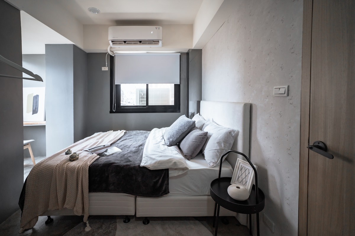 室內的灰白主色,配搭北美木紋銅色傢俱及家飾, 用心為您的居住空間提供沈靜優雅的感覺。日韓系電器的選用,不論是無線充電藍牙喇叭 ,大螢幕伸縮高清電視 ,都能滿足您對影音效果的要求。房源位於高樓內縮樓層,阻絕不必要的噪音並滿足您對景觀 ,安靜及隱私的要求。大樓並配有全天候警衛,住戶專屬電梯 ,公用大露台 ,以及地下收費停車場, 位處西門町核心路段,無論搭乘捷運或自駕都非常方便。El disseny interior basat en tons terra ofereix una atmosfera càlida, tranquil·la, curativa i encantadora. Equipament de l'habitació: llit doble, bany privat amb dutxa, aire condicionat, televisor 4K amb pel·lícules i Netflix, wifi, il·luminació ambiental i reproductor de música amb connexió sense fils i ports de càrrega USB.