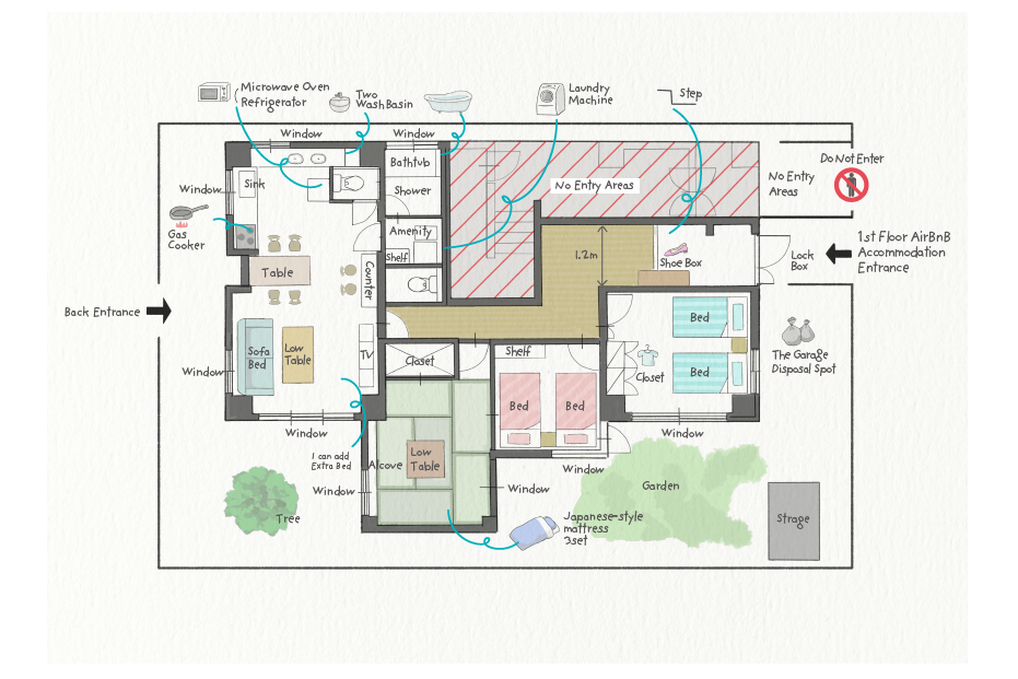 Aquesta habitació té un espai còmode de 68 m2 a la planta baixa amb 3 dormitoris, sala d'estar, menjador, cuina i balcó, adequat per a famílies i un grup d'amics per a estades llargues. És a 2 minuts a peu de l'estació de Hatagaya (幡ヶ谷), que és a 2 parades/3 minuts de l'estació de Shinjuku en tren i a 15 minuts de l'estació de Shibuya en tren o autobús. Al voltant de l'estació hi trobaràs moltes botigues, restaurants locals, cafeteries, botigues de conveniència obertes les 24 hores i molt més. És una zona residencial típica japonesa amb un barri agradable.