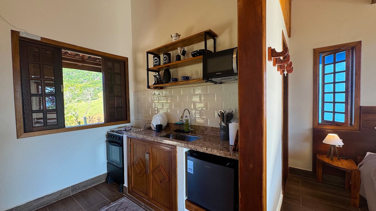 Descansa en una escapada amb vistes a les muntanyes. Ideal per a aquells que volen recarregar les piles, celebrar l'amor amb una copa de vi o fins i tot treballar a distància acompanyat d'una bona tassa de cafè! A 18 minuts del centre de Sto Antônio do Pinhal (12 km) A 45 minuts de Campos do Jordão. NOTA 1: Trecho en un camí de terra: només 3 minuts NOTA 2: Des de la porta fins a la caseta tenim una ascensió pronunciada, però pavimentada; comprova els pneumàtics per als dies de pluja. NOTA 3: No servim àpats