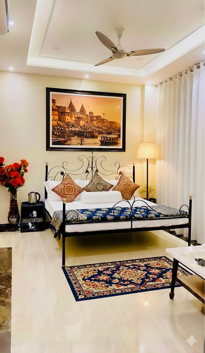 Serene Varanasi Luxury Homestay, a tranquil retreat in lush greenery. Featuring two interconnected bedrooms, this space comfortably fits families or small groups. Enjoy affordable luxury with a dedicated workspace, AC, and Wi-Fi. Perfect for families, remote workers, and spiritual seekers looking for a peaceful base in the holy city.