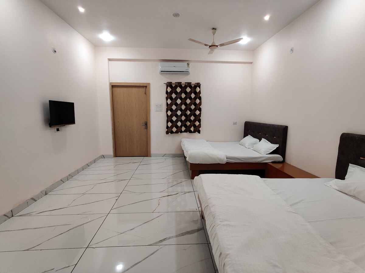 Enjoy a comfortable and peaceful stay in our well-maintained guest house room, ideally located just 200 m from the Main Temple perfect for devotees who prefer walking distance convenience. We are also only 300 m from the main market. The Bus Stand and Railway Station are just 2 km away. we do not have in-house parking, there are multiple paid parking facilities available nearby