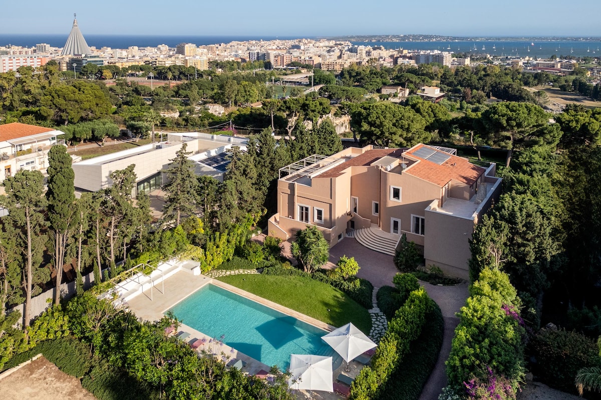 La villa è immersa in un ampio giardino di 4.000 mq che domina il Teatro Greco e l’Orecchio di Dionisio, in una zona residenziale caratterizzata dalla presenza di altre eleganti dimore. Grazie alla sua posizione rialzata, la proprietà gode di una splendida vista sul mare della città. L’edificio conserva l’imponente architettura degli anni ’50, ispirata alle grandi ville di Miami. Sul fronte si apre un raffinato giardino all’italiana, mentre sul retro si estende una spaziosa piscina alberata.