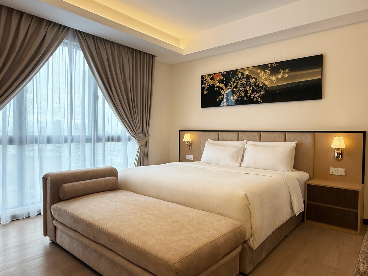 Un allotjament amb temàtica japonesa situat a l'apartament amb serveis més nou de Melaka Raya. La vista panoràmica de la ciutat durant la nit és el millor que veuràs a Melaka des d'un pis alt. L'edifici està equipat amb piscina infinita amb vistes al mar, piscina d'un carril amb vistes a la ciutat i gimnàs a la planta 13. Amb el projector intel·ligent i internet d'alta velocitat de 100 Mbps, pots gaudir de diversos canals de televisió gratuïts mentre descansa a l'allotjament. Els allotjaments tenen un llit «king size», banyera, nevera i un projector intel·ligent.