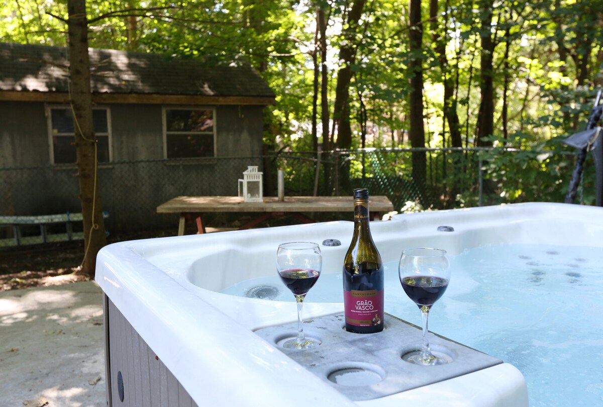 Et donem la benvinguda a The Boho Hideaway! L'escapada perfecta en les 4 estacions, a prop de muntanyes d'esquí i platges a la comunitat a la vora del llac de Midland, ON i Georgian Bay. Relaxa't en aquest acollidor bungalou amb banyera d'hidromassatge privada i sauna! Gaudeix de 5 dormitoris espaiosos, 2 cuines, 2 sales d'estar i sala de jocs. Hi ha molt d'espai perquè la teva família i els teus amics puguin relaxar-se còmodament. Escalfa't a les nits fredes i rostifa dolços en una foguera de llenya o acurruca't al costat de la taula de foc sota la nit estrellada
