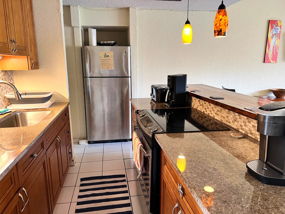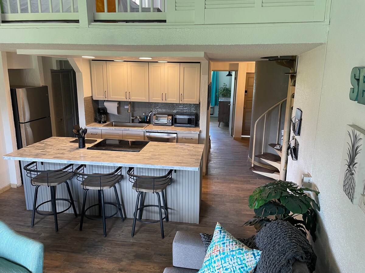 El nostre apartament BELLAMENT RENOVAT es troba just a la platja: res entre tu i una vista d'un milió de dòlars, sinó 2 palmeres i 40 peus de sorra blanca de sucre. El nostre apartament amb sostre de catedral ofereix tot el que puguis desitjar: cuina completa, dormitori principal, bany complet, loft per dormir amb dos llits individuals i mig bany. També hi ha aire condicionat central, wifi gratuït i llençols orgànics i serveis de bany orgànic, i l'ús d'un caiac. Per què no consideres llogar un apartament de dues habitacions pel preu d'un dormitori?