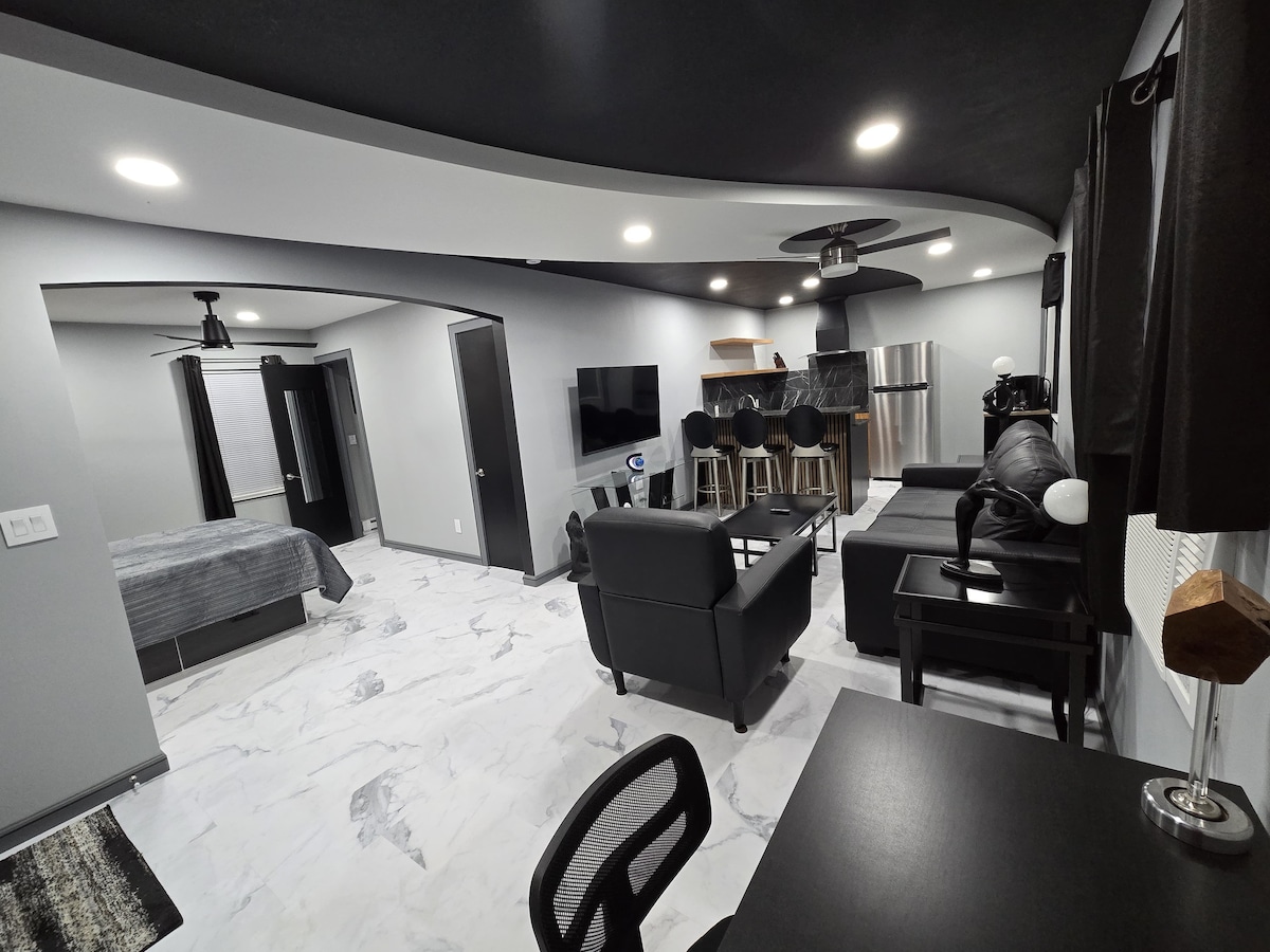 Great single bedroom apartment, located walking distance to downtown where there are restaurants and a movie theater. We have stocked your kitchen with all the essential tools. The bathroom will give you all the essentials with the blow dryer and shampoo, conditioner soap.