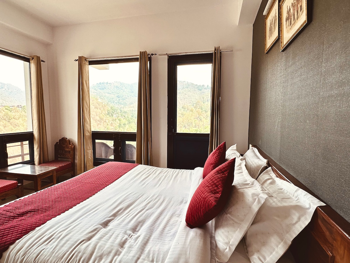 Una espaiosa suite familiar d'una habitació a Kasauli, que ofereix un dormitori acollidor, una zona d'estar còmoda, un bany modern i un balcó privat amb vistes tranquil·les a la muntanya de pins. Ideal per a famílies, parelles i escapades tranquil·les a la muntanya.