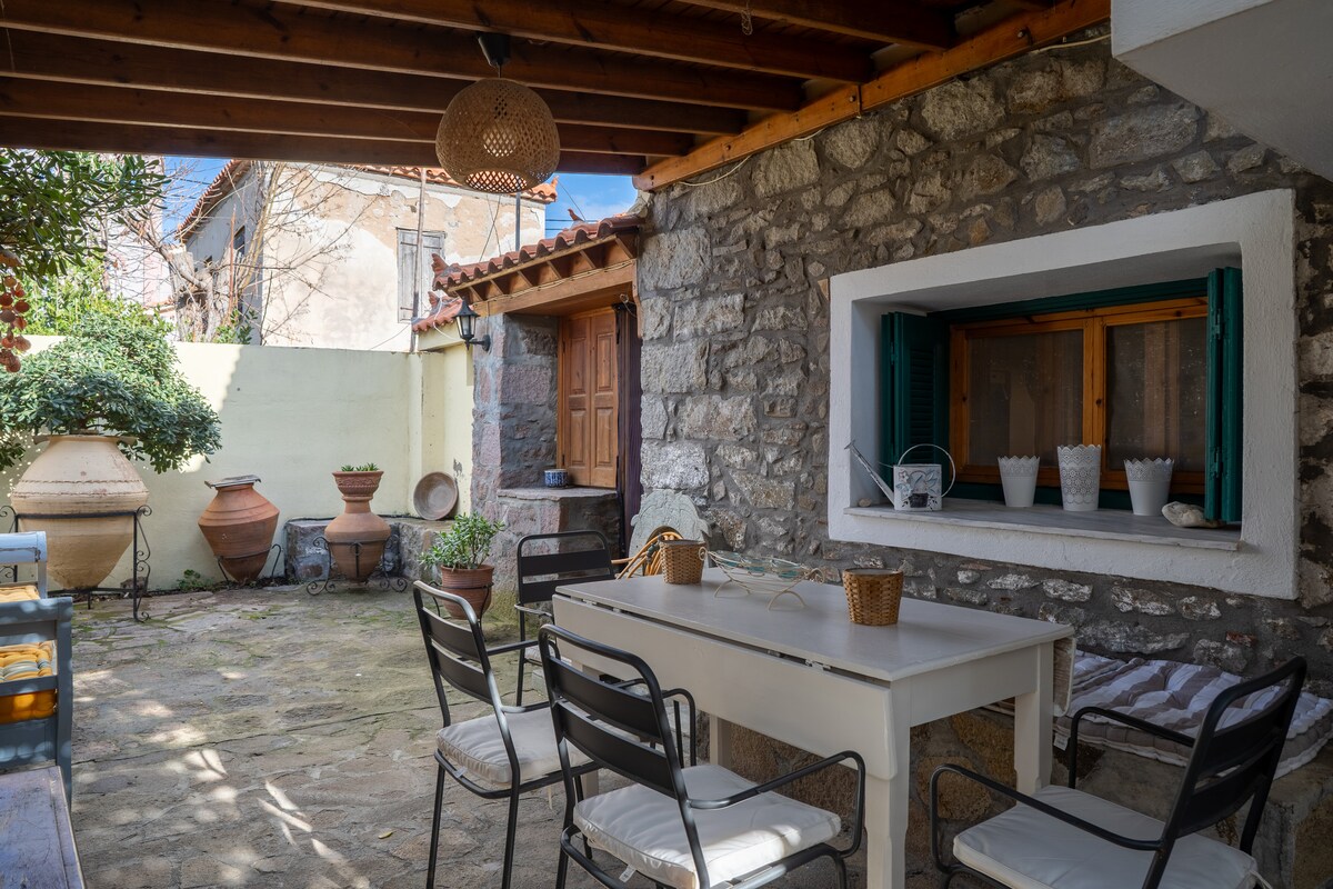 La nostra casa de pedra amb un finestral, una zona interior de 55 m2, més de 100 m2 amb el seu propi jardí i un aparcament comú addicional i hort, està dissenyada perquè dues persones o famílies petites s'allotgin còmodament. Pots gaudir de les vistes del mar Egeu des de gairebé arreu de la nostra casa durant tot el dia; pots gaudir del sopar amb la vista exquisida sota els arbres amb l'amanida i la barbacoa que has preparat amb les verdures que reculles del jardí a la nostra cuina a l'aire lliure.