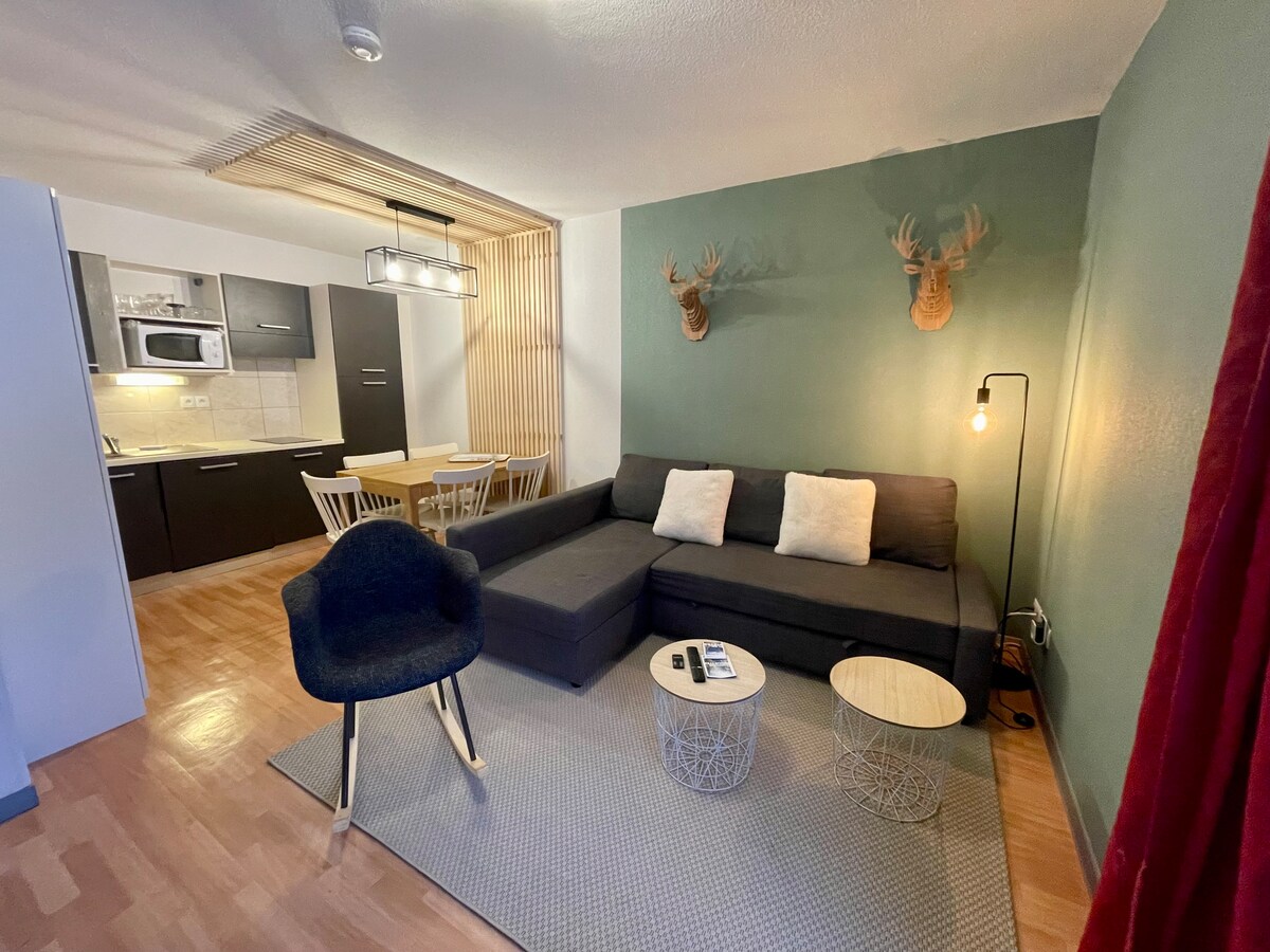 Facing south of 36m2, the apartment has • 1 separate bedroom with king size bed • 1 alcove with 2 bunk beds • 1 living room with sofa bed • 1 kitchen area • 1 bathroom with separate WC • 1 large balcony overlooking the slopes Equipment: fridge, electric hob, microwave, coffee maker, oven, washing machine, TV, hair dryer… Close to the slopes and shops Pets welcome – NON SMOKING apartment Delivery of keys and inventory on site