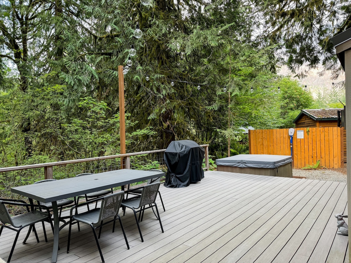 Preciosa caseta recentment renovada a la vora del riu, a les muntanyes Cascade, just al costat del riu Skykomish. Gaudeix d'unes vistes increïbles del mont Relaxeu-vos a la vora de la foguera o a la impressionant plataforma envoltant per gaudir d’un bany d’hidromassatge, una dutxa a l’aire lliure i una barbacoa, i gaudiu de l’espai de luxe modern de muntanya a l’interior: sauna, llit «king size», llit «queen size» de loft, cuina nova i molt més! A 30 segons de cascada impressionant, a 2 minuts de grans rutes de senderisme i a 30 minuts de l’estació d’esquí de Steven’s. S'admeten mascotes amb tarifa addicional. Reserva la Three Peak Cabin del costat per ampliar la memòria del grup!