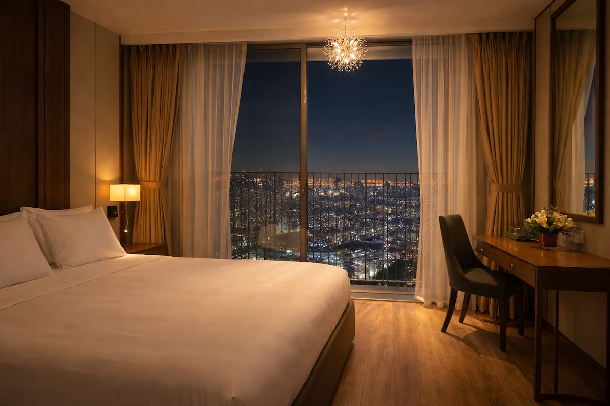 This stylish high-floor studio in Panorama Nha Trang offers a perfect blend of comfort and modern convenience. Floor-to-ceiling windows frame sweeping city views right from your king-size bed with premium 5-star linens. The spacious layout includes a wide work desk, a 43” Smart TV, and a large, well-appointed bathroom. Whether you’re here for business or leisure, you’ll enjoy a serene retreat in the heart of Nha Trang, just steps away from the beach, dining, and entertainment.